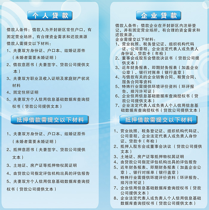 開封市開封新區(qū)開寶小額貸款有限公司(以下簡稱開寶小貸)是一家民營股份制公司,注冊資金壹億元。公司主營業(yè)務為辦理小額貸款,提供財務咨詢等,同時滿足中小企業(yè)短期資金需求。公司嚴格按照“只貸不存”的原則,以自有資金發(fā)放貸款;竭誠為中小企業(yè)、個體工商戶提供支持與幫助。