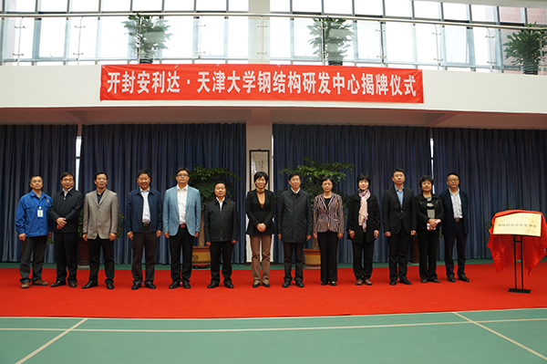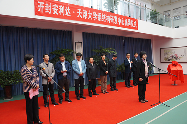 為搭建高層次科技創(chuàng)新平臺,實(shí)現(xiàn)安利達(dá)產(chǎn)品轉(zhuǎn)型升級,提高科技成果轉(zhuǎn)化效率,推進(jìn)鋼結(jié)構(gòu)和裝配式建筑產(chǎn)、學(xué)、研深度結(jié)合,在開封市委、市政府、市人才辦及開封市科技局的大力支持下,2016年10月22日上午,天津大學(xué)·開封安利達(dá)金屬工程有限公司鋼結(jié)構(gòu)聯(lián)合研發(fā)中心揭牌儀式在安利達(dá)工業(yè)園研發(fā)樓隆重舉行。天津大學(xué)黨委書記李家俊、開封市市長侯紅親自為天津大學(xué)·開封安利達(dá)金屬工程有限公司鋼結(jié)構(gòu)聯(lián)合研發(fā)中心揭牌,李書記隨行專家教授、候市長隨行各級領(lǐng)導(dǎo)、安利達(dá)核心團(tuán)隊(duì)成員約50余人出席參加揭牌儀式, 開封市市委常委組織部部長何偉、天津大學(xué)建工學(xué)院副教授王小盾 、安利達(dá)董事長孫建設(shè)分別在揭牌儀式上致辭發(fā)言,揭牌儀式由開封市副市長孫曉紅主持。